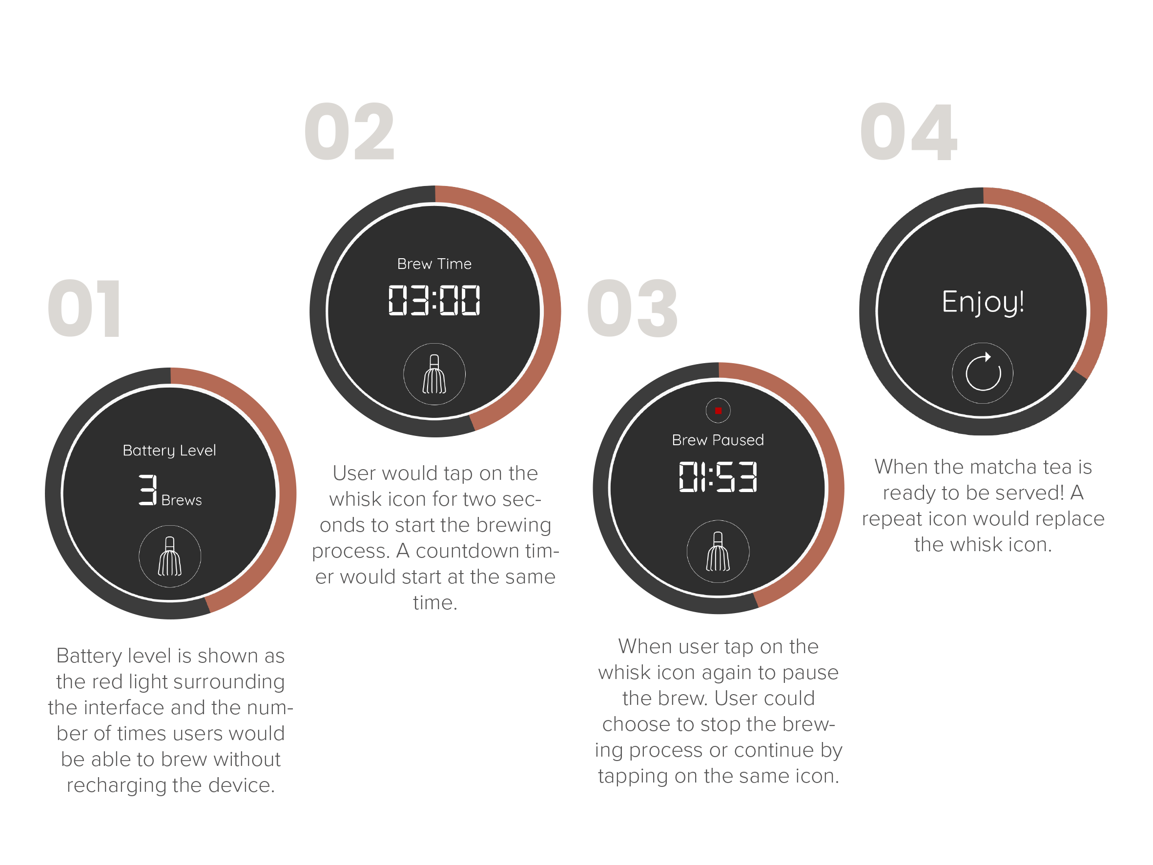 A modern twist to the traditional matcha brewing process. Users could brew a perfectly smooth and frothed matcha consistently with a press of a button while maintaining the important traditional aspects of the brewing process.